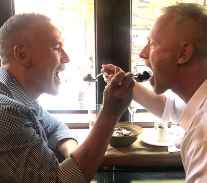 After the official part, we needed our first glass of something. Years ago we drove into the city from CT for a romantic dinner at the Cub Room in SoHo – our first NYC date. We always wanted another quintessential New York experience like that – great food, good conversation, perfect ambiance and service like a local. Well, the Cub Room is closed and in its place is a livelier neighbourhood restaurant and bar called The Dutch. “Two champagnes please, we’re finally legal”. The service was fantastic and they loved our story. So much so that the surprise bowl of peanut crumble topped with ice cream and chocolate sauce accompanied by a sparkler became our wedding cake . . . feeding each other and all. Erik resisted the urge to shove it in his new spouses face.
