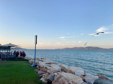 Finally getting into Townsville, we're met with what fortunately doesn't live up to its recently voted number one spot. Sure, it’s industrial, but we stayed near a beachside promenade, found a relaxed water-views restaurant with tasty margaritas, had a morning of good coffee and walked the stone bulkhead next to the Ferry Terminal to look back at this (unofficial) capital of North Queensland. All in all, we think Townsville should do an ad campaign: “. . . not as sht as you think!” Glad we stopped for the night.