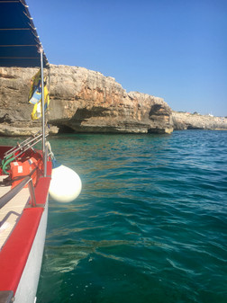 It’s so good to have local contacts when you travel. On their advice, we took a trip down to Santa Maria de Leuca to explore the grotte that line the coast. Because of its position at the south-eastern-most point of the Italian mainland, you can take a boat out of SM de Leuca to see caves on both the Adriatic and Ionian Seas. We booked in with Piccola Nautica for an afternoon departure and killed time with a walk around and a harbourside lunch at Lido Azzurro. Polpo again – and again it was beautifully prepared. After a post-lunch dip at the harbour beach, we headed over to our launch point to wait with the all-Italian passengers who we’d be cruising with. Our hopes for any English briefing of the grotte were pretty much out the window. That was confirmed as we were leaving the marina and the captain launched into a full Italian description of what we were seeing with no follow-on in English and our blank faces and embarrassingly apologetic looks unfortunately couldn’t bring any results. We again lamented that we didn’t take the time to learn the language. But the beauty was all around us, mother nature was at her finest with the blue, blue sea and the majestic cliffs . . . so sit back, enjoy the views and the sound of Italian spoken by a boat captain. What’s not to like? At our Adriatic Sea stop, there were a number of dark caves to swim through – R opted in (adventurous!) and E opted out (claustrophobic!). The light along the seabed gave a neon glow to the blue water entering what appears to be an underwater river. A very unique site. The caves along the Ionian Sea were a bit more open and we swam together, admiring the wind and water sculpted cave tops and the see-to-the-ocean floor cave bottoms. A final long swim workout back to the boat after a lot of eating without exercise during our Puglia stay was just what the trainer ordered.